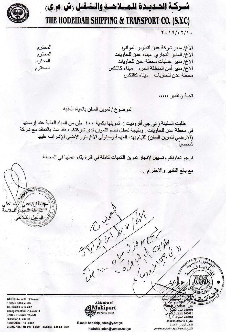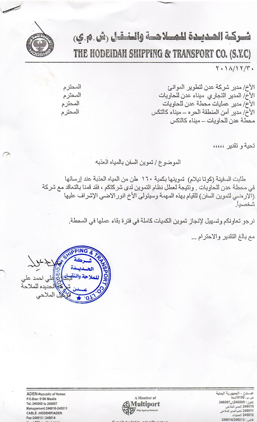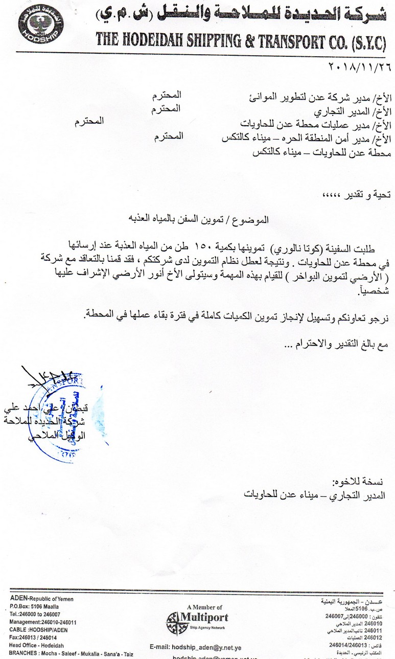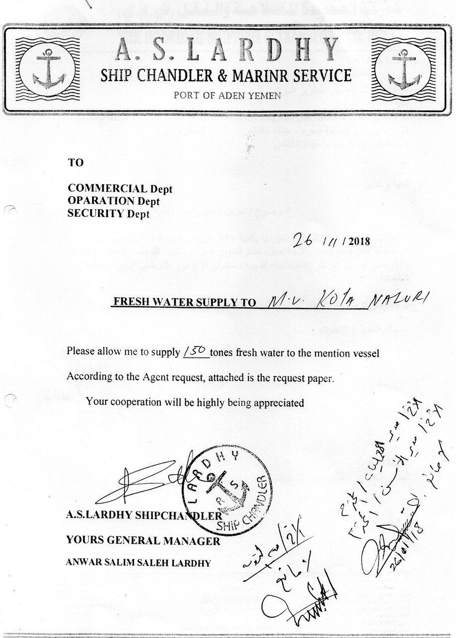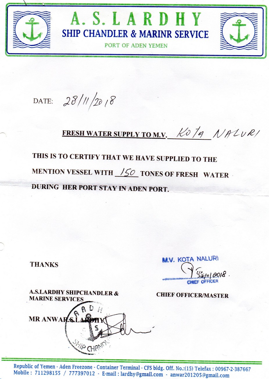 Fresh water supply includes supplying the vessels with fresh water by trucks from the city borehole to the vessels using small 4 tones trucks. The fresh water is very good for washing, cooking, cleaning and also Engine use.
